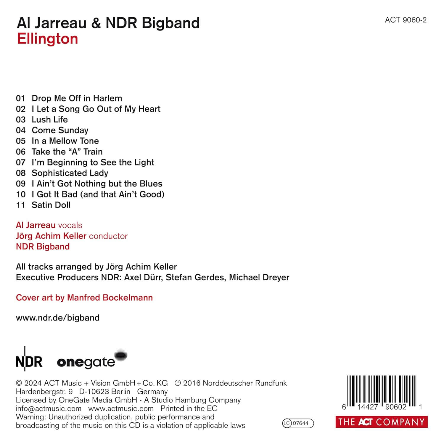 Jarreau’s long association with NDR prompted Jörg Achim Keller, chief conductor of the NDR Bigband, to suggest a collaboration with the singer in 2016, “Doing a production with Al and Ellington’s music was something I had wanted to do since the early 2000´s,” he remembers. “Al’s reaction was very positive from the start.” Jörg prepared a list of some hundred Ellington titles and, as Jarreau later recalled, “We just went down the list, and it was a case of, ‘Oh, that one works for me,’ and ‘Let’s do this one as an old gut-bucket blues – what was important for me was to find myself inside the music and maybe make a different kind of statement about Ellington so people could hear the music in a different way from anything they had heard before.”