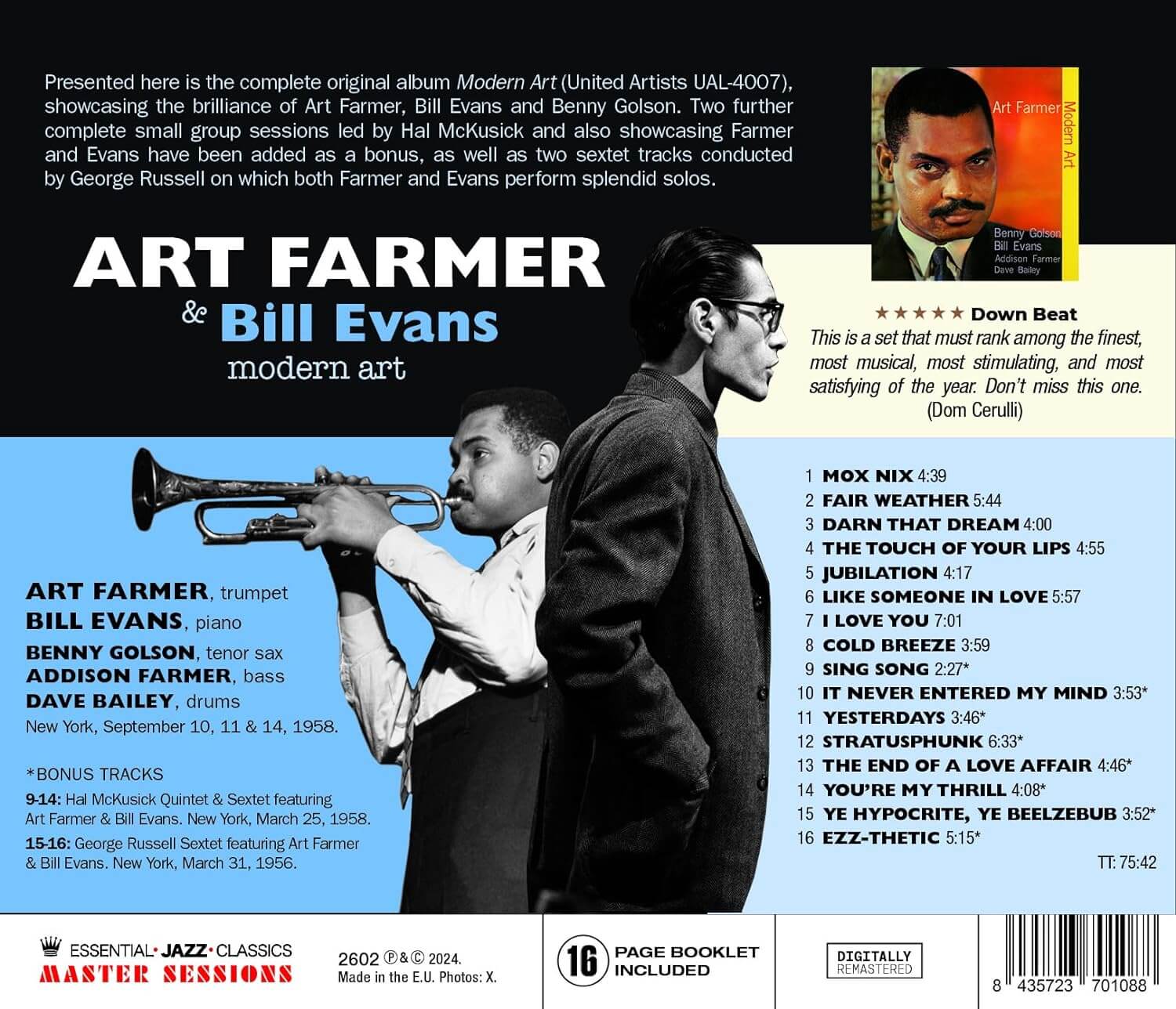 THE COMPLETE ALBUM + 8 BONUS TRACKS – INCLUDES 16-PAGE BOOKLETWITH MEMORABILIA AND UPDATED LINER NOTES. Presented here is the complete original album Modern Art, highlighting the brilliance of Art Farmer, Bill Evans, and Benny Golson.