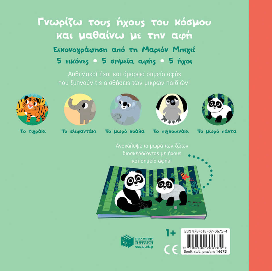 Με 5 εικόνες, 5 σημεία αφής, 5 ήχους και 5 μωρά ζωάκια: το τιγράκι, το ελεφαντάκι, το μωρό κοάλα, το πιγκουινάκι και το μωρό πάντα.