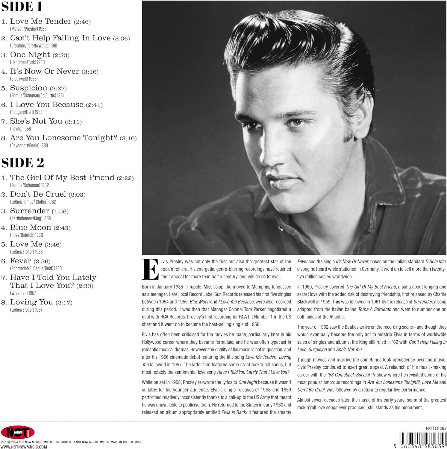 Elvis Presley was not only the first but also the greatest star of the rock’n’roll era. His energetic, genre-blurring recordings have retained their appeal for more than half a century, and will do so forever. Elvis has often been criticised for the movies he made, particularly later in his Hollywood career where they became formulaic, and he was often typecast in romantic musical dramas. However, the quality of his music is not in question, and after his 1956 cinematic debut featuring the title song Love Me Tender, Loving You followed in 1957. The latter film featured some great rock’n’roll songs, but most notably the sentimental love song Have I Told You Lately That I Love You? Almost seven decades later, the music of his early years, some of the greatest rock’n’roll love songs ever produced, still stands as his monument.