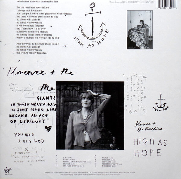 Το “High As Hope – Vinyl LP” είναι το τέταρτο άλμπουμ του Βρετανικού συγκροτήματος Florence + The Machine, κυκλοφόρησε το 2018 και είναι ένας δίσκος που αποτυπώνει την προσωπική εξέλιξη της frontwoman Florence Welch και τον πολιτικό της ακτιβισμό. Ο δίσκος δείχνει την πιο ευαίσθητη πλευρά του συγκροτήματος, αλλά και τη δύναμη της φωνής της Welch. Το άλμπουμ περιλαμβάνει τραγούδια όπως τα “Hunger”, “Sky Full of Song” και “Big God”. Η ομάδα συνεργάζεται με μουσικούς και παραγωγούς όπως οι Emile Haynie, Kamasi Washington και Jamie xx. Αυτή η επανακυκλοφορία σε βινύλιο LP περιλαμβάνει το αυθεντικό εξώφυλλο του άλμπουμ.
