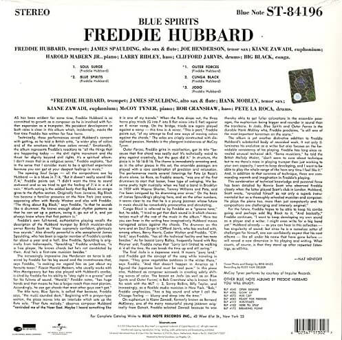 Vinyl LP pressing. A Blue Note essential, Blue Spirits was the 10th album by trumpeter Freddie Hubbard released on the Blue Note label. It would be his last studio album for Blue Note, only followed up by the live album the next year – The Night of the Cookers. It features performances by Hubbard, James Spaulding, Joe Henderson, Harold Mabern, Jr., Larry Ridley, Clifford Jarvis, Big Black, Kiane Zawadi, Hank Mobley, McCoy Tyner, Bob Cranshaw, Pete LaRoca.