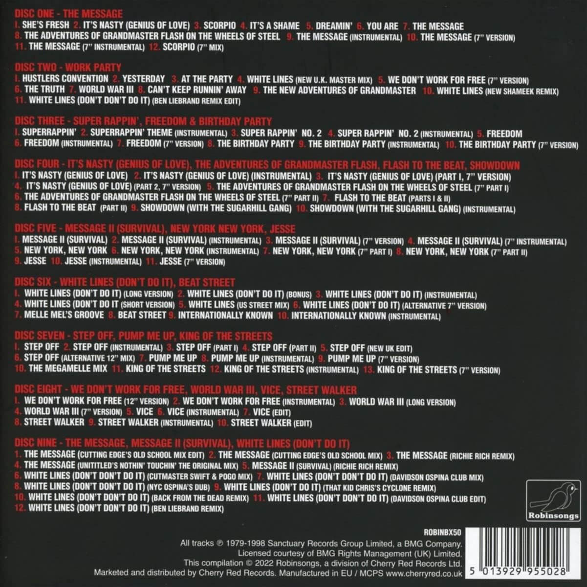 - Featuring all of their Top 100 hits in a deluxe CD box set covering their entire Sugarhill Records output of singles, including full length versions of the top 10 hits ‘The Message’, ‘White Lines’ and ‘Step Off’