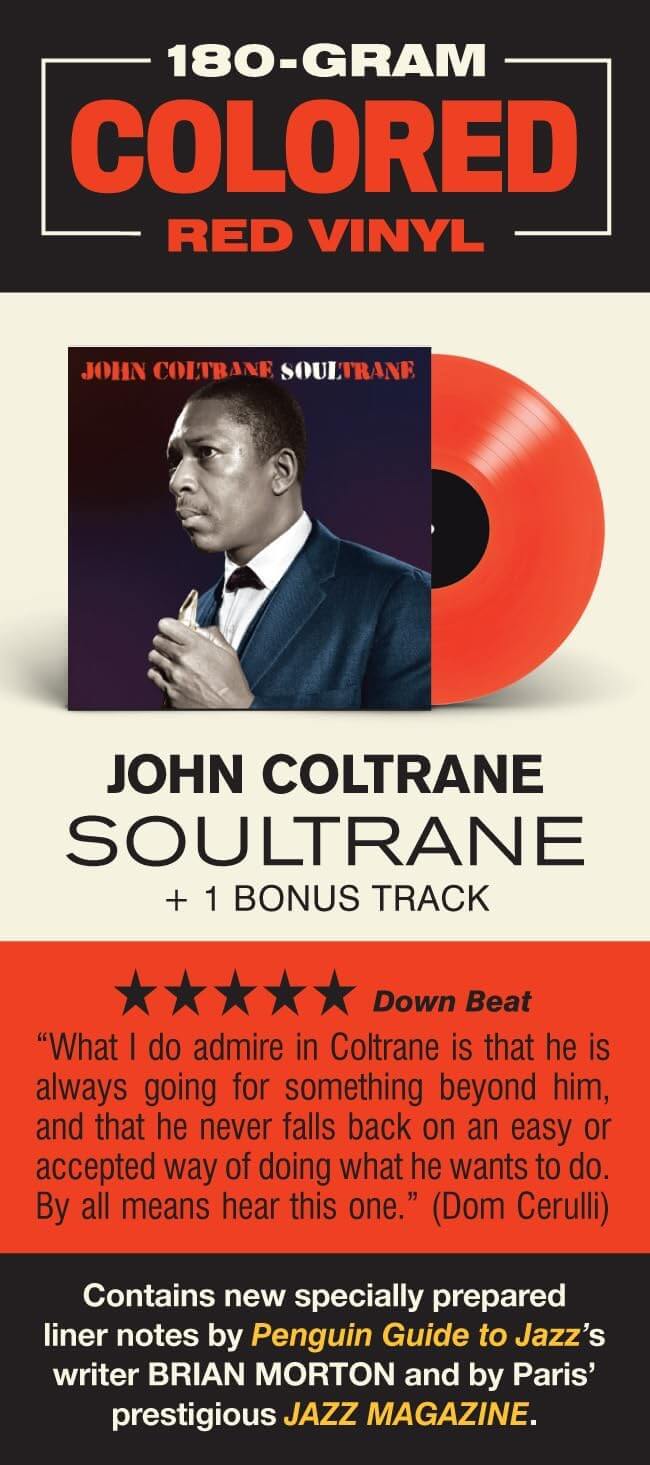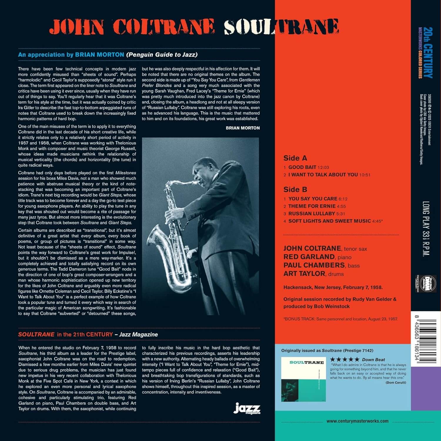 In addition to being members of Miles Davis’ band, John Coltrane, Red Garland and Paul Chambers recorded several projects together without the trumpeter. Soultrane is a superb quartet album featuring the three musicians along with drummer Art Taylor (he and Chambers were both members of the Red Garland Trio). The LP was recorded in between the two Miles Davis Sextet sessions that produced the album Milestones. Among the highlights are a lengthy reading of Tadd Dameron’s “Good Bait”, and Trane’s earliest and probably best version ever of Billy Eckstine’s ballad “I Want to Talk About You”, which would become a favorite inthe saxophonist’s live repertoire. 180-gram VIRGIN VINYL LIMITED EDITION. The Complete Album + 1 Bonus Track