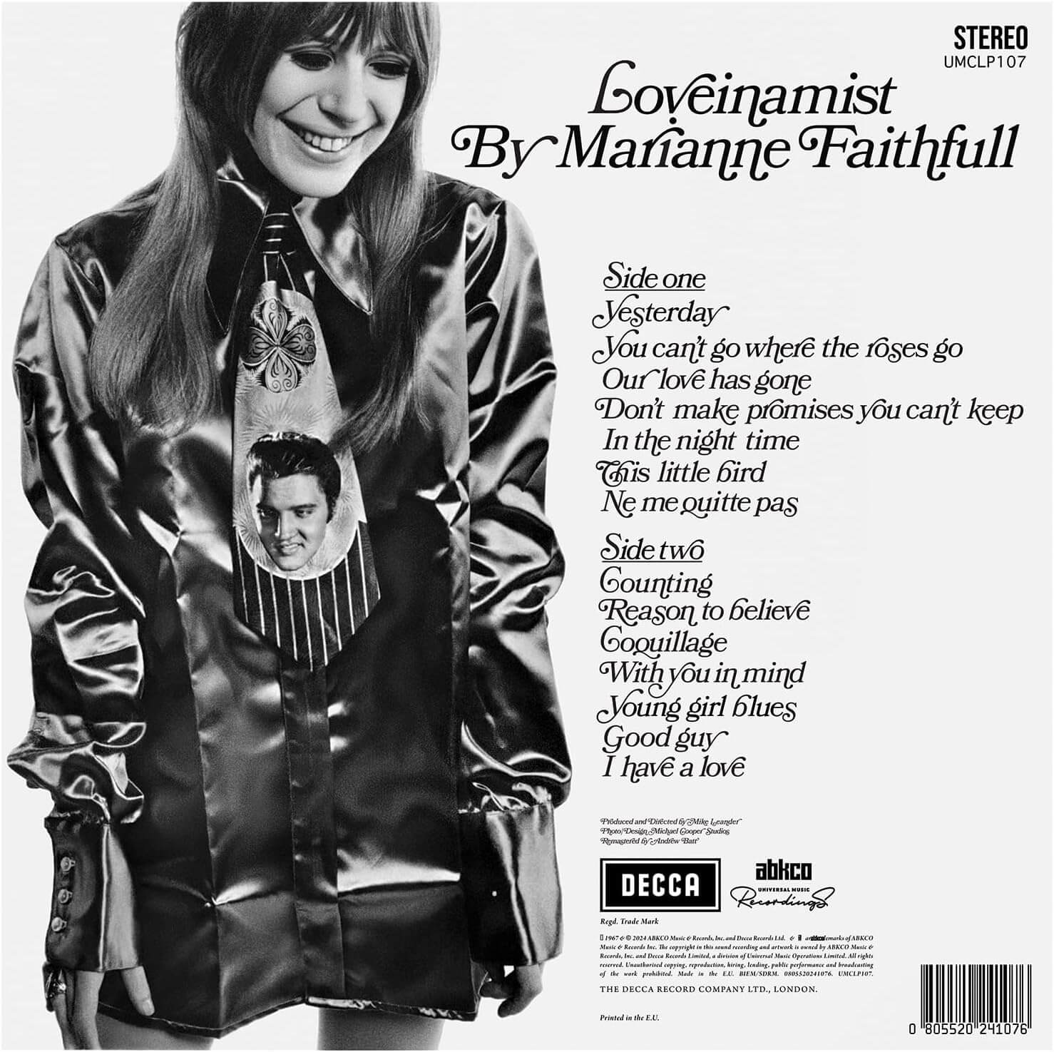 Loveinamist, Marianne’s second pop LP for Decca and last album of the 60’s has been remastered from the original tapes by the Grammy nominated Andrew Batt who also provides detailed sleevenotes which Marianne contributed to before her passing in January 2025. Released in March 1967, Loveinamist was a hybrid comprised of earlier hit singles ‘Yesterday’ and ‘This Little Bird’ alongside tracks released on her US only album Faithfull Forever 7 months earlier and new recordings in the folk-pop style that defined her signature sound. The album features a clutch of impressive interpretations from the songwriters that suited her best, including a string laden ‘Counting’ by Bob Lind, a stoic ‘Reason To Believe’ by Tim Hardin, gorgeous folk-pop ballad ‘With You In Mind’ by Jackie DeShannon, and the baroque psychedelia of Donovan’s ‘In The Night Time’. There was something in Donovan’s words music and ideas that seemed to sit particularly well with Marianne’s interpretive gifts and another of his compositions ‘Young Girl Blues’ is given a powerful treatment distinctly at odds with the rest of the album’s folky romanticism. Loveinamist also reflects Marianne’s penchant for French music with beautiful versions of ‘Ne Me Quitte Pas’ from the 1964 musical Les Parapluies De Cherbourg and ‘Coquillages’, Marianne’s own French translation of ‘Cockleshells’, which originally appeared on North Country Maid.