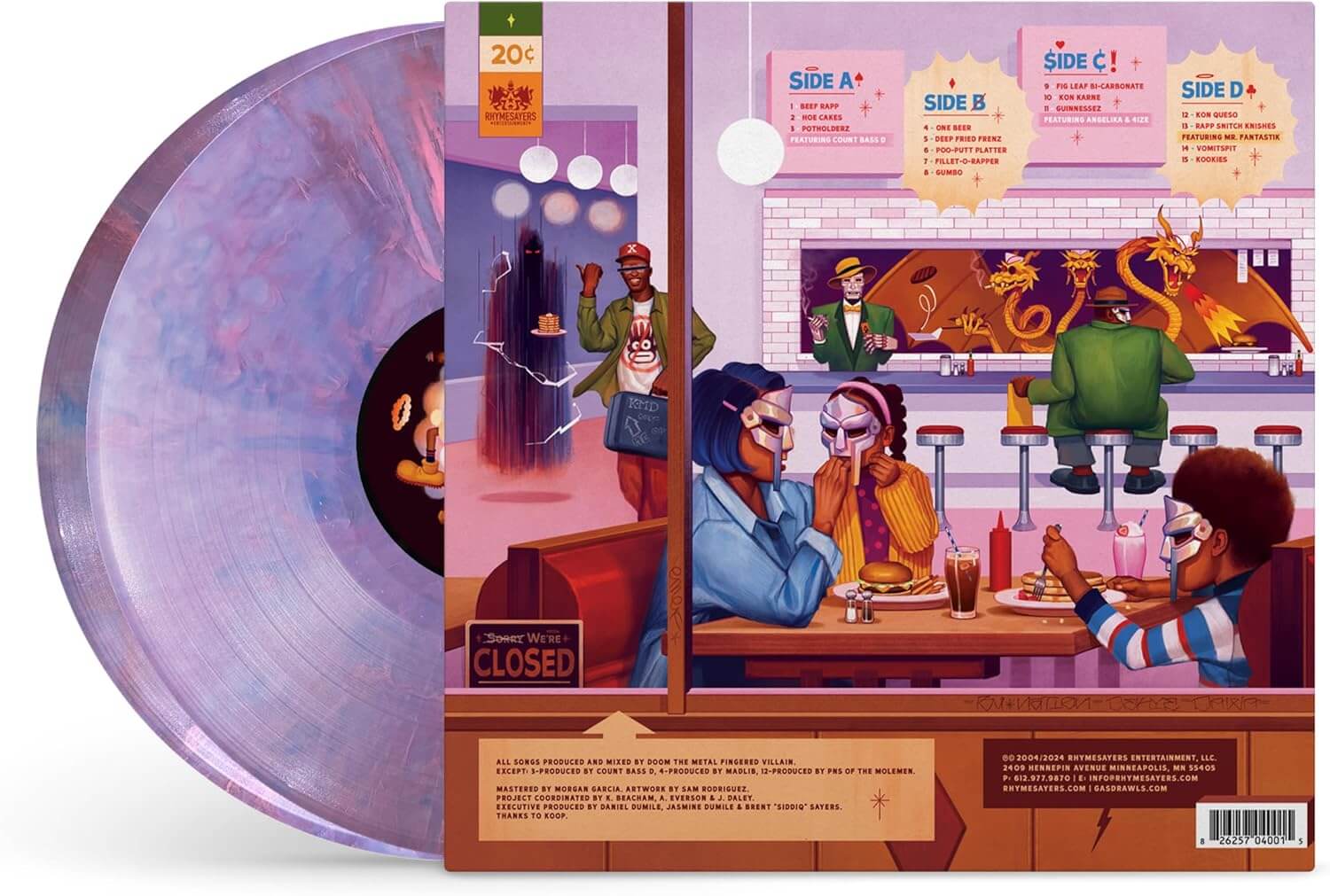 Originally released in 2004, MF DOOM’s MM..FOOD is hailed as a classic hip-hop album full of inventive production, brilliant wordplay, and unique themes. Celebrated for its seamless blend of humor, wit, and social commentary, the album ushers listeners into a bizarre world of food-related metaphors, painting a bitterly comedic portrait of a life tainted by vice, violence, and jealousy. It was a brilliant and novel concept that gave DOOM plenty of room to explore the album’s subjects. Throughout MM..FOOD, DOOM embeds complex ideas within seemingly simple narratives. Album opener “Beef Rapp” is a multi-pronged metaphor reminding listeners of the dangers involved in the glorification of conflict, especially within the rap game. “Hoe Cakes” borrows its name from the sweet, hot water cornmeal patties, which he uses as a symbol to rhyme about indulgence and excess. Continuing the motif, DOOM uses the Madlib-produced “One Beer” to fold layers of depth about escapism and ego, while the popular “Rapp Snitch Knishes” critiques the self-incrimination and contradictory behaviors of some rappers. Overall, MM..FOOD is both a social commentary and a piece of social satire, showcasing MF DOOM’s ability to blend serious themes with his unique, playful lyrical style. In celebration of the album’s 20th anniversary, MM..FOOD has been repackaged with all new artwork by Sam Rodriguez! Produced by MF DOOM, except “One Beer” produced by Madlib, and “Kon Queso” produced by PNS of the Molemen. Guest features include Count Bass D, Mr Fantastik, Angelika and 4ize.