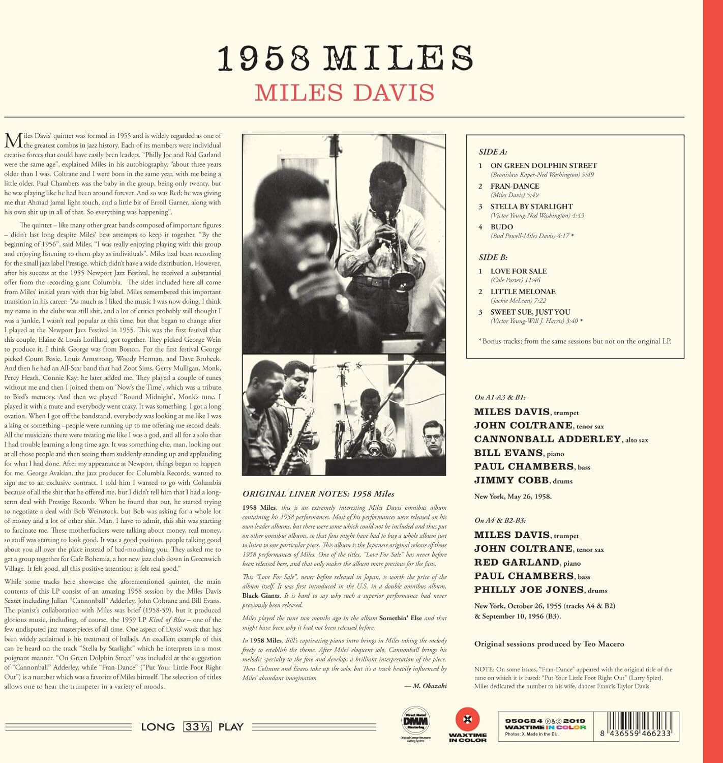 1958 Miles is a compilation album by American jazz musician Miles Davis, released in 1974 on CBS/Sony.Recording sessions for the album took place on May 26, 1958, at Columbia’s 30th Street Studio and September 9, 1958, at the Plaza Hotel in New York City. 1958 Miles consists of three songs featured on side two of the LP album Jazz Track, which was released earlier in 1958, one song from the same session not appearing in the album (“Love for Sale”), and three recordings from Davis’ live performance at the Plaza Hotel with his ensemble sextet.The recording date at 30th Street Studio served as the first documented session to feature pianist Bill Evans performing in Davis’ group.