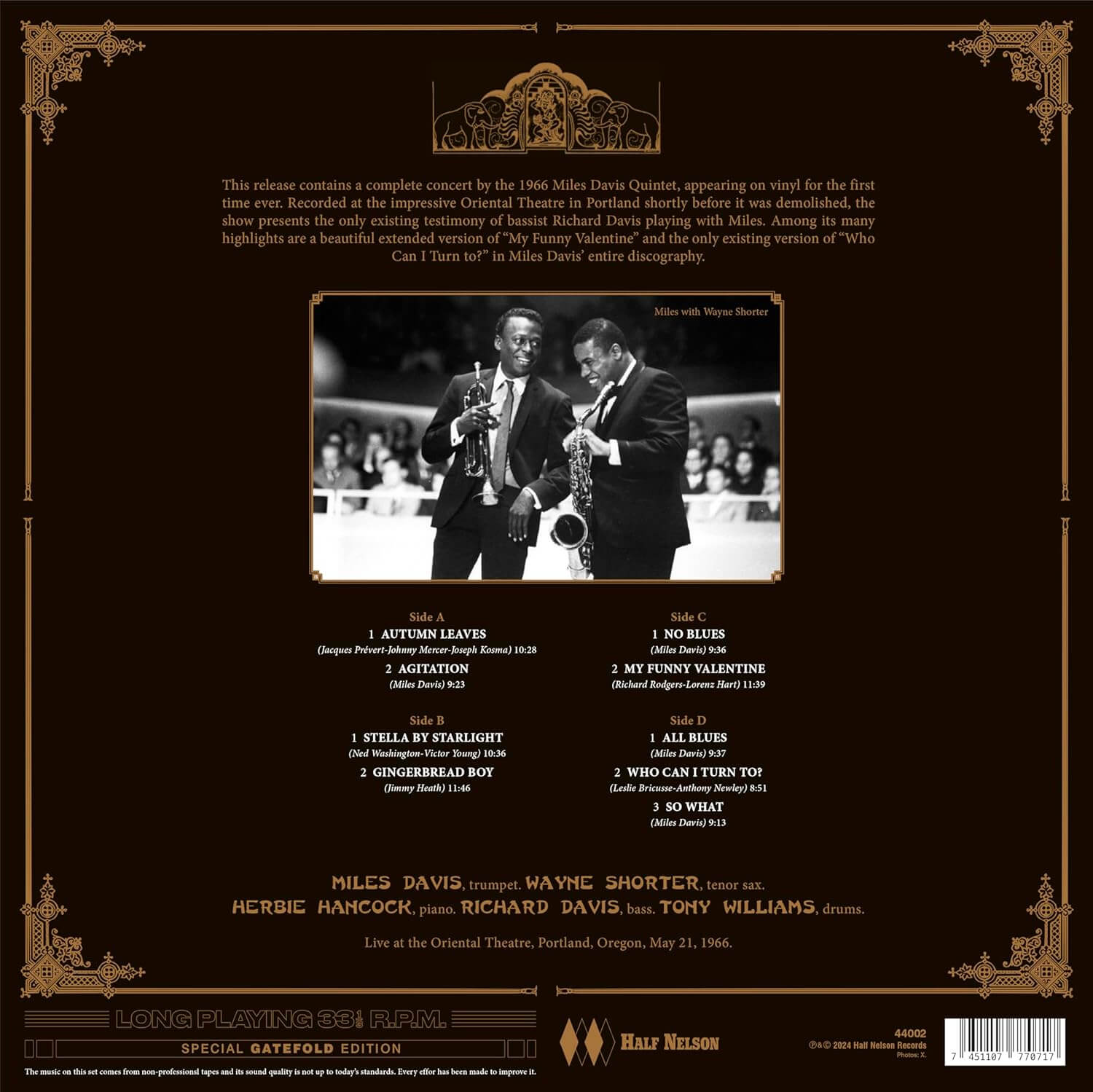 Recorded at the iconic Oriental Theatre in Portland shortly before it was sadly demolished, the concert marks the only existing testimony of bassist Richard Davis playing with Miles.