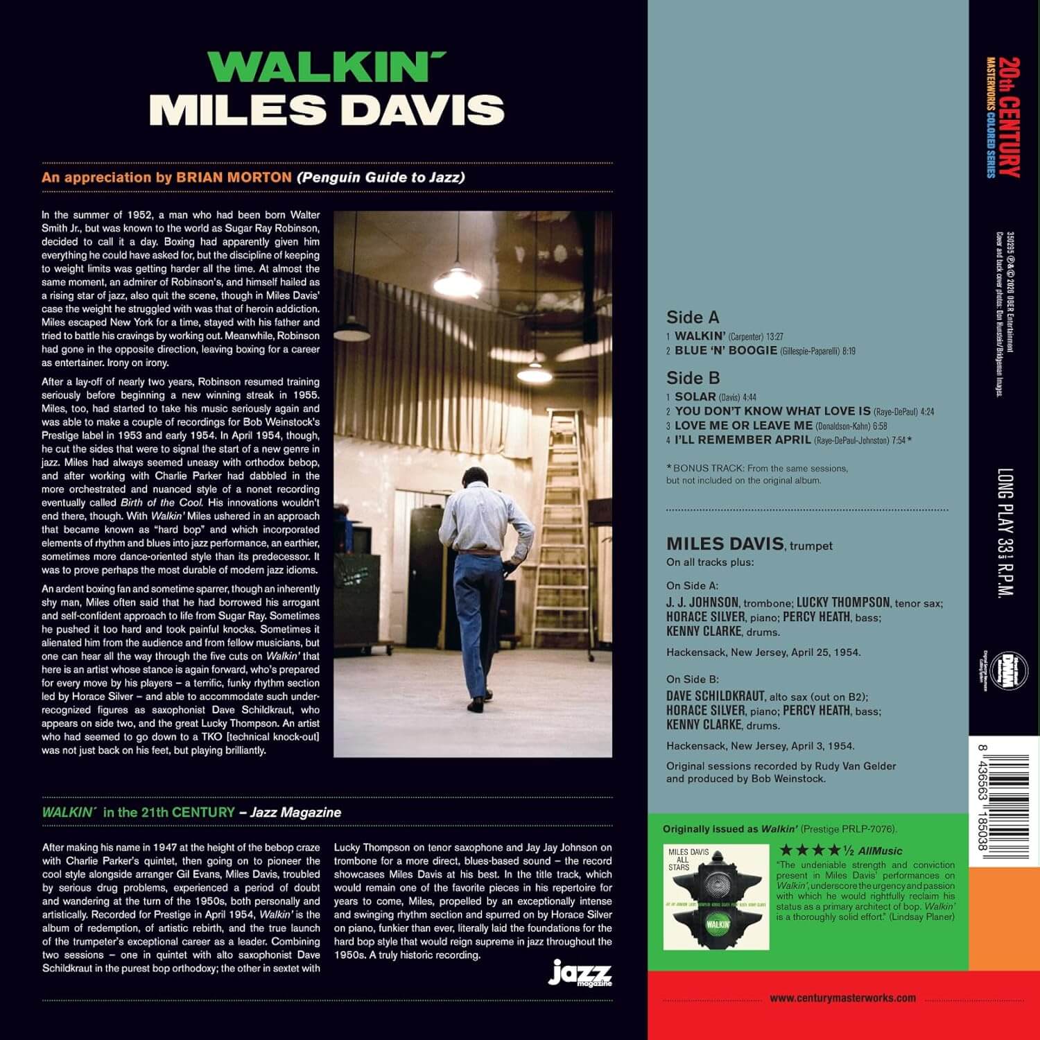 Walkin’ was (and is) a key album in Miles Davis’ discography. It contains the product of two rather different sessions. The first date (which is actually the second chronologically) yielded just two tracks, although, something new for the time, they were long enough to fill up one side of an LP. Miles is in the company of such stars as J. J. Johnson on trombone, Horace Silver on piano, Percy Heath on bass, and Kenny Clarke on drums.