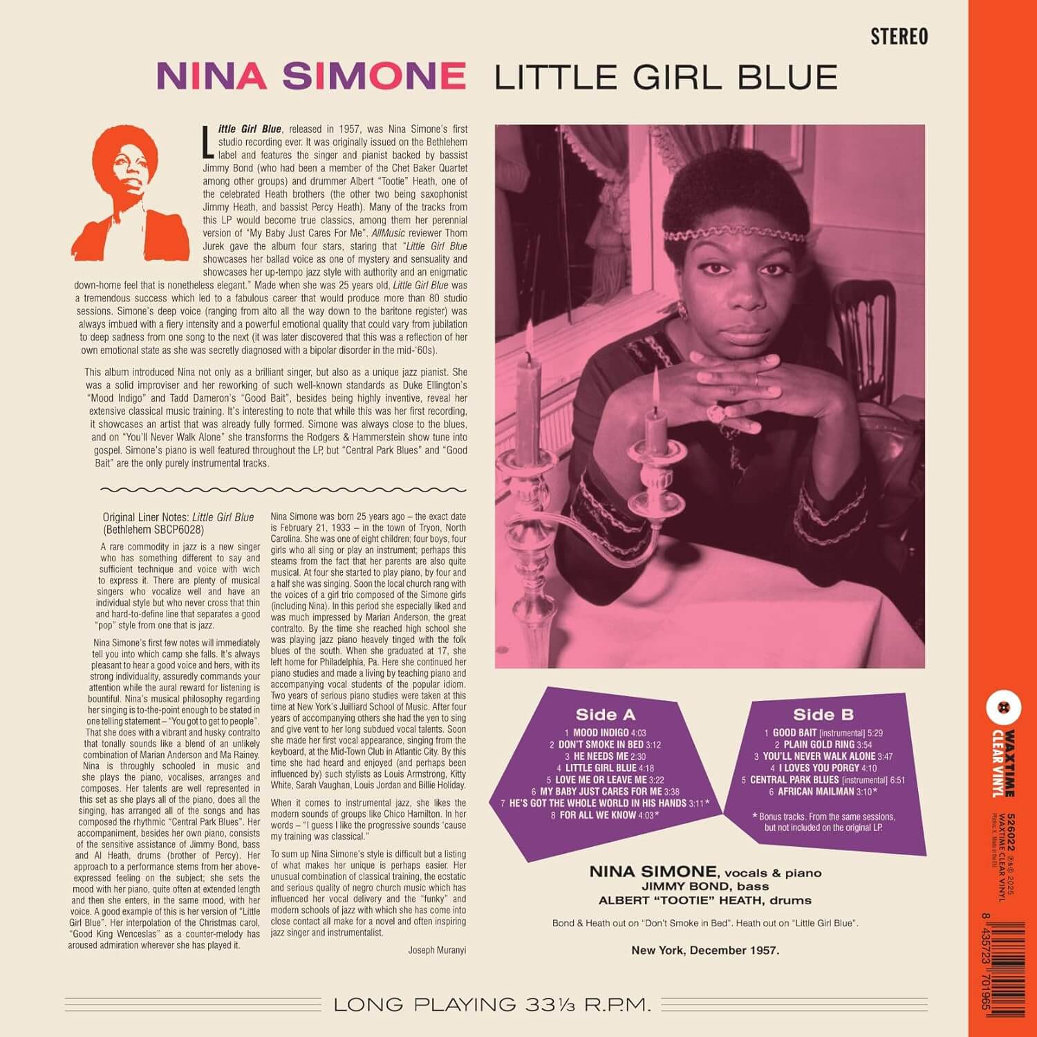 Little Girl Blue, released in 1957, was Nina Simone’s first studio recording ever. It was originally issued on the Bethlehem label and features the singer and pianist backed by bassist Jimmy Bond and drummer Albert “Tootie” Heath. Many of the tracks from this LP would become true classics, among them her perennial version of “My Baby Just Cares For Me”. This album introduced Nina not only as a brilliant singer, but also as a unique jazz pianist. She was a solid improviser and her reworking of such well-known standards as Duke Ellington’s “Mood Indigo” and Tadd Dameron’s “Good Bait”, besides being highly inventive, reveal her extensive classical music training. THE COMPLETE ALBUM + 3 BONUS TRACKS – 180-GRAM CRYSTAL CLEAR VINYL – LIMITED EDITION