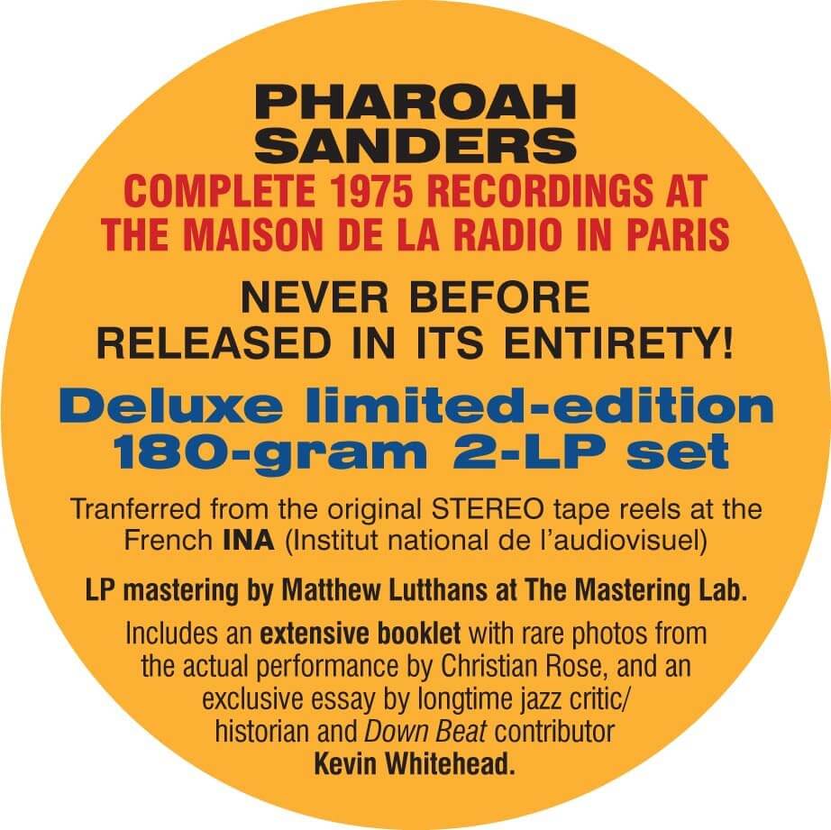 PHAROAH SANDERS’ COMPLETE 1975 RECORDINGS AT THE MAISON DE LA RADIO IN PARIS. Tranferred from the original STEREO tape reels at the French INA (Institut national de l’audiovisuel). LP mastering by Matthew Lutthans at The Mastering Lab. Includes an extensive booklet with rare photos from the actual performance by Christian Rose, and an exclusive essay by longtime jazz critic/historian and Down Beat contributor Kevin Whitehead. NEVER BEFORE RELEASED IN ITS ENTIRETY! Deluxe limited-edition 180-gram 2-LP gatefold set.