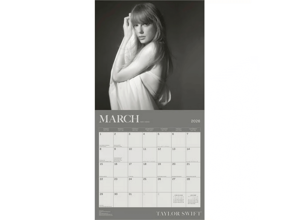 Taylor Swift Official Calendar is a calendar for the year 2026. The calendar is a(n) Pop Music Wall (30x30cm) calendar.