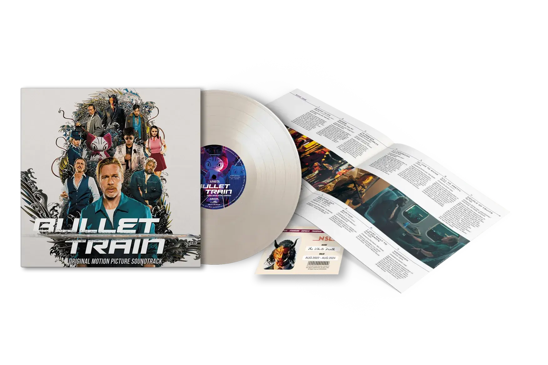 The soundtrack for Bullet Train is available on vinyl and comes in different editions, all based on the characters in the movie. All editions include a 4-page booklet, but each edition contains an exclusive Bullet Train boarding pass with corresponding picture of the character. This is the limited “White Death” edition on white coloured vinyl.